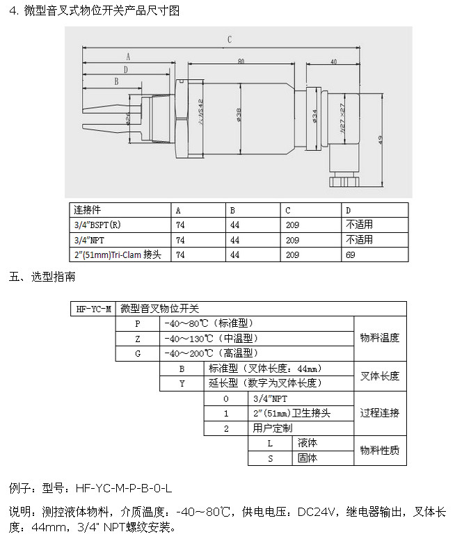 HF-YC-微型音叉式物位開關是一種新型的物位開關。本產(chǎn)品是一種采用音叉原理設計的液點液位開關。它是一種緊湊開關,配備耐用的不銹鋼本體和音叉,可用于各種液體應用場合。3/4”或 1”經(jīng)濟型液位開關通過螺紋安裝與管道或儲罐上,或者通過衛(wèi)生連接件安裝于食品工業(yè)設施。直接負荷開關適用于所有電源或PNP輸出,用于可編程邏輯控制器 (PLC)的直接接口。提供防止溢出認證,僅適用于安全區(qū)域。