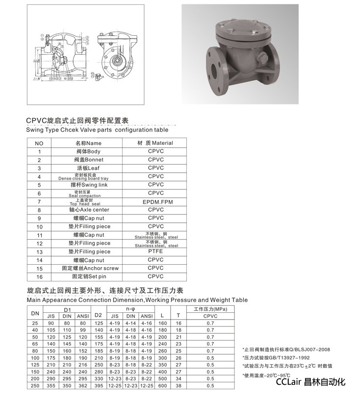 (2)使用溫度廣:CPVC塑料止回閥的使用溫度為-40℃~+95℃