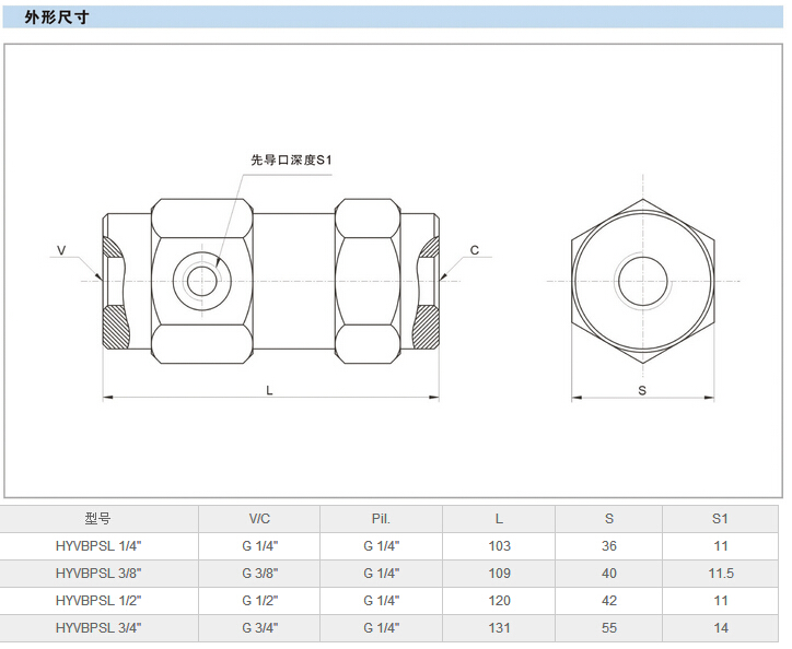 HYVBPSL 1/4",HYVBPSL 3/8",HYVBPSL 1/2",HYVBPSL 3/4",3位單先導(dǎo)式單向閥