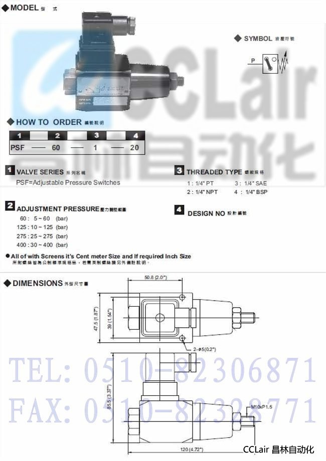 詳細信息 PSF-60-4-20,PSF-125-4-20,PSF-275-4-20,PSF-400-4-20,調(diào)整式壓力開關(guān),