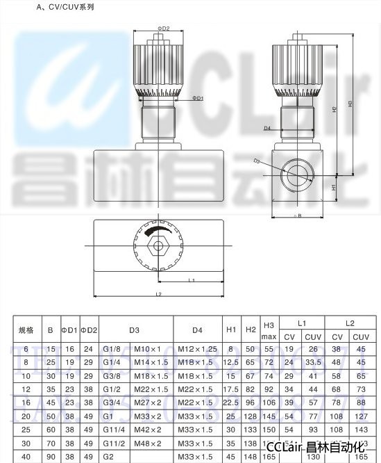 CV/CUV系列節(jié)流閥/單向節(jié)流閥在流量調(diào)整時(shí),調(diào)節(jié)手柄上有參照刻度,順時(shí)針調(diào)節(jié)流量減小,逆時(shí)針調(diào)節(jié)流量增大。
