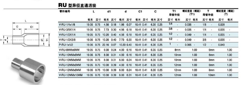詳細(xì)信息 V-RU-1/4*1/8,V-RU-3/8*1/4,V-RU-8MM*6MM,V-RU-10MM*6MM,異徑直通活接頭