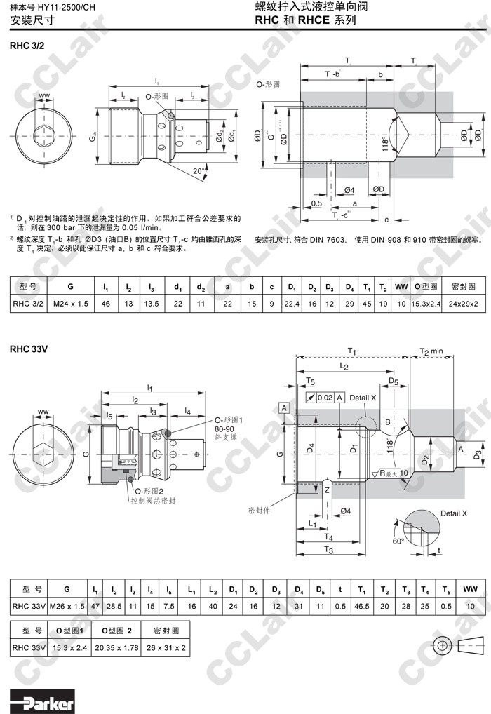 詳細(xì)信息 RHC3/2,RHC33V,RHCE33V,Parker螺紋擰入式液控單向閥