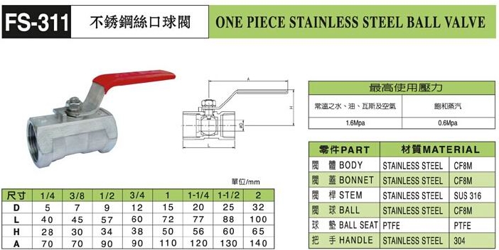 | 閥桿STEM | STAINLESS STEEL | SUS 316 |