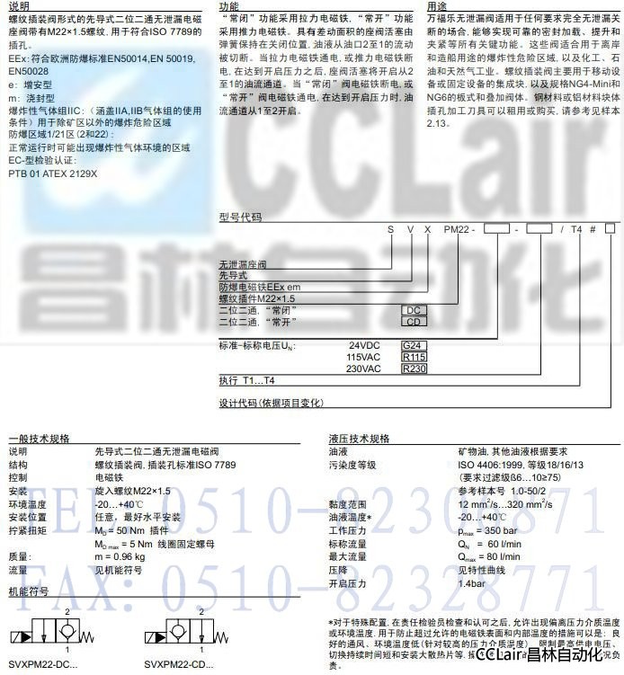 SVXPM22-DC,SVXPM22-CD,先導(dǎo)式插裝式防爆無(wú)泄漏電磁閥EEx em II