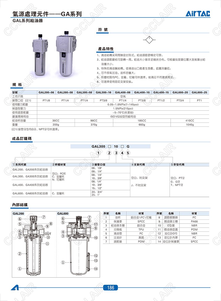 GAL200-06,GAL200-08,GAL300-08,GAL300-10,GAL400-08,GAL400-10,AIRTAC給油器