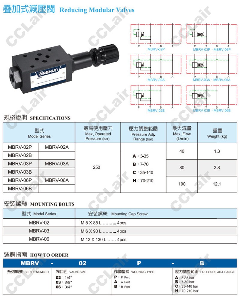 MBRV-02P,MBRV-02B,MBRV-02A,MBRV-03P,MBRV-03A,MBRV-03B,MBRV-06P,MBRV-06A,MBRV-06B,ASHUN油順疊加式減壓閥