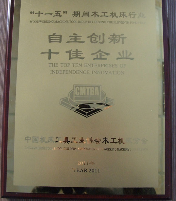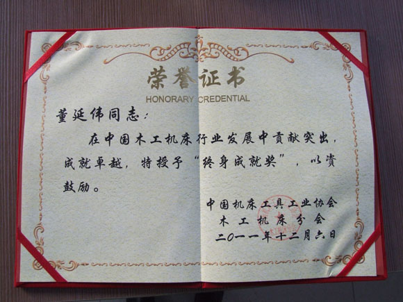 在中國機(jī)床工具工業(yè)協(xié)會木工機(jī)床分會的表彰大會上,公司被授予木工機(jī)床行業(yè)十一五“自主創(chuàng)新十佳企業(yè)”稱號,公司董事長董延偉獲得中國木工機(jī)床行業(yè)“終身成就獎”。