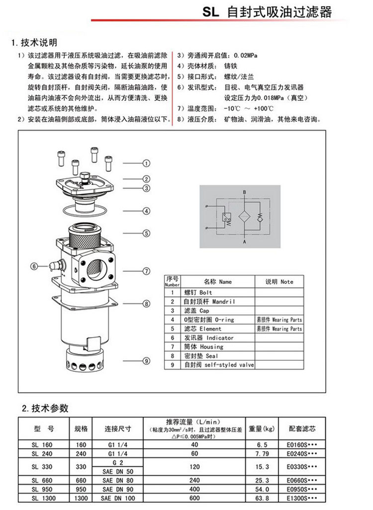 SL160,SL240,SL330,SL660,SL950,SL1300,SL1300W180FFBP,SL950P10FEBP,自封式吸油過濾器 |