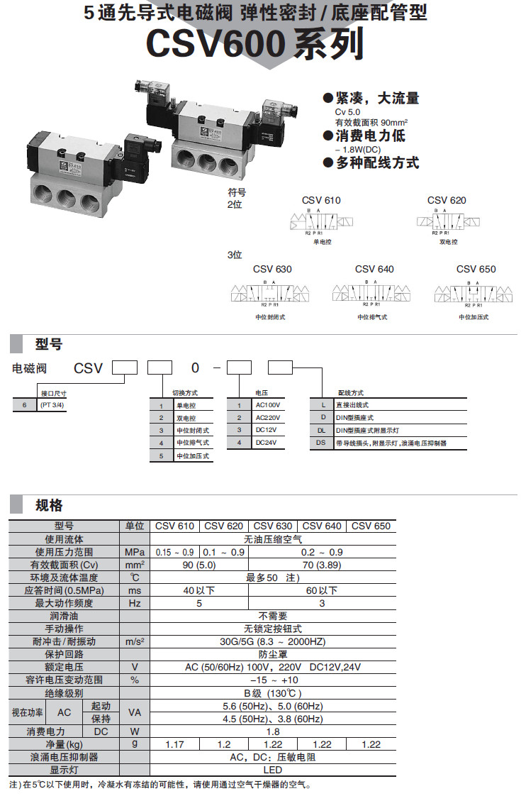 CSV610-1L,CSV620-2L,CSV640-1D,CSV650-2D,CSV630-4DL,CSV640-1DS,5通先導式電磁閥