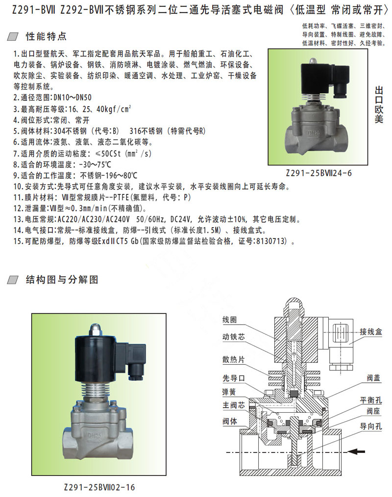 Z291-10BVII,Z291-15BVII,Z291-20BVII,Z291-25BFVII,Z291-32BFVII,不銹鋼先導(dǎo)活塞式電磁閥