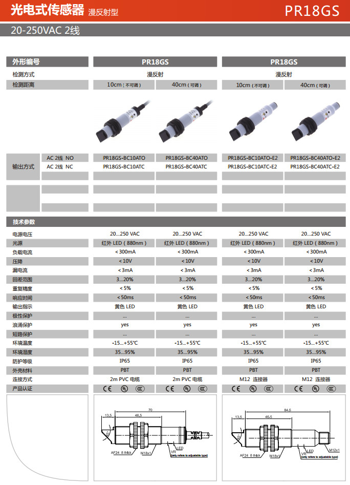 PR18GS-BC10ATO,PR18GS-BC10ATC,PR18GS-BC40ATO,PR18GS-BC40ATC,PR18GS-BC10ATO-E2,光電式傳感器 |