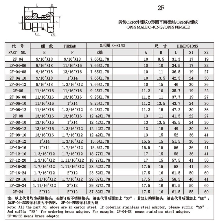2F-04,2F-06,2F-08,2F-10,2F-12,2F-16,2F-20,2F-24,2F-04-06,美螺紋O形圈密封接頭