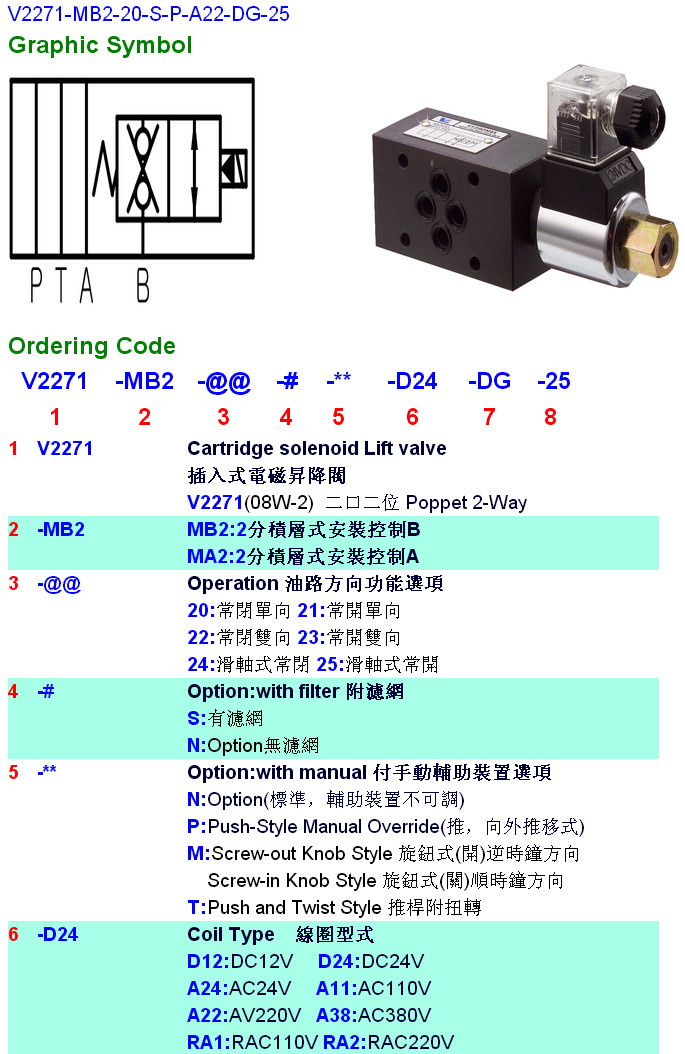 V2271-MA2-20,V2271-MA2-21,V2271-MA2-22,V2271-MB2-23,V2271-MB2-24,V2271-MB2-20-S-P-A22-DG-25,HYDROMAX插入式電磁升降閥