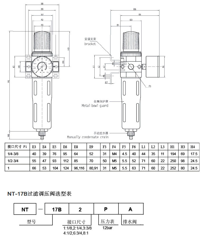特點 帶水分離合器的燒結式過濾器; 管式安裝或支架安裝; 輸入壓力1.5~16bar; 工作壓力0.5~16bar; 過濾精度5μm; 溫度范圍0~60℃; 材料 殼體:壓鑄鋅;過濾杯:PC;金屬保護罩:鉛合金; 密封:丁腈橡膠;調壓手輪:POM。