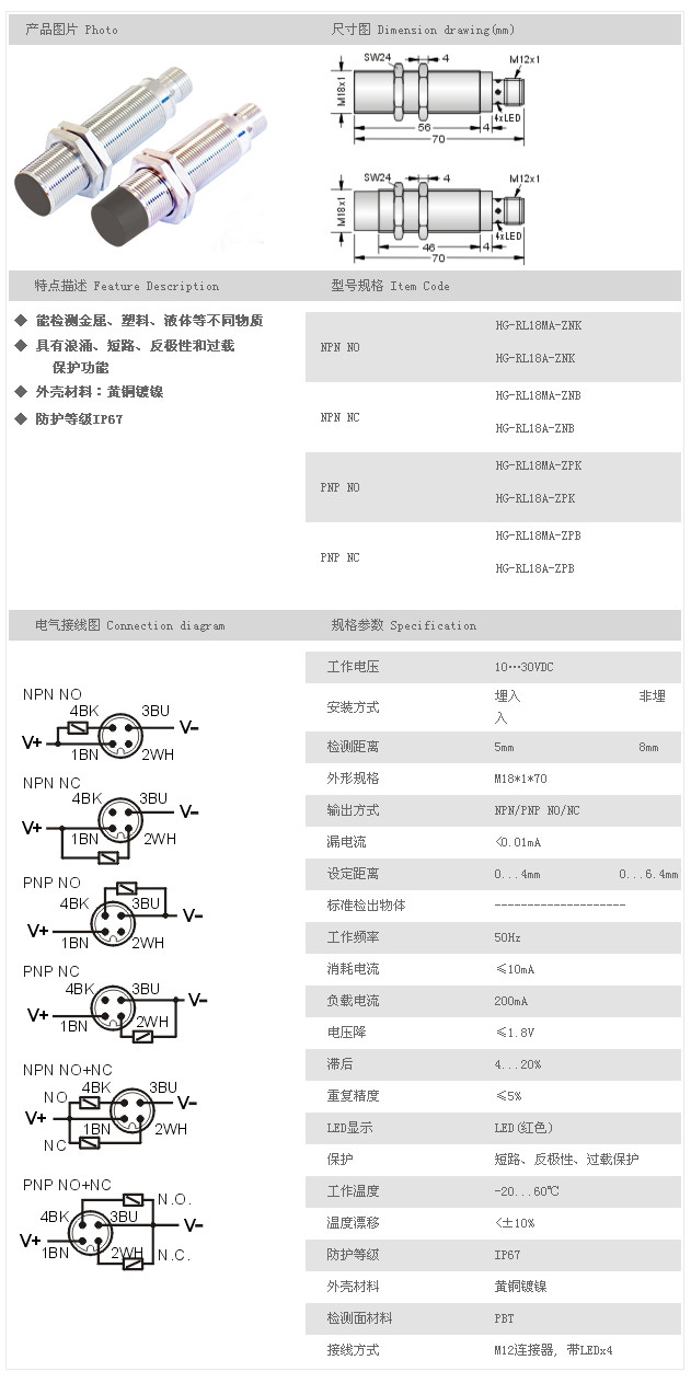 電容式接近傳感器 HG-RL18MA-ZNK,HG-RL18A-ZNK,HG-RL18MA-ZNB,HG-RL18A-ZNB