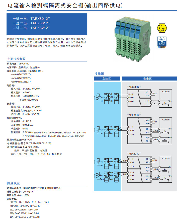 TAEX8012T,TAEX8612T,TAEX8212T,電流輸入檢測(cè)端隔離式安全柵