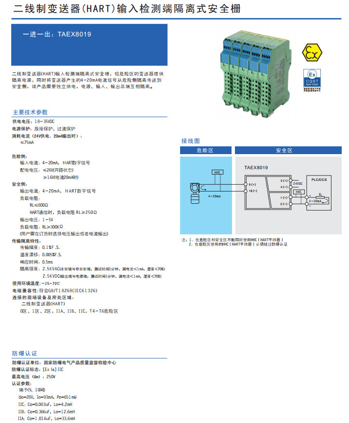 TAEX8019,二線制變送器輸入檢測端隔離式安全柵