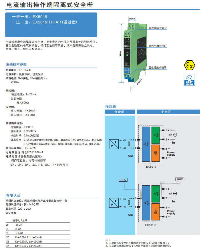 EX5019,EX5019H,電流輸出操作端隔離式安全柵