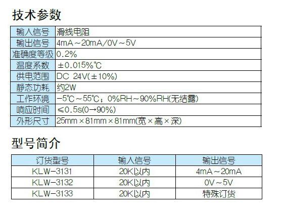 KLW-3131,KLW-3132,KLW-3133,KLW-313,滑線電阻輸入信號隔離處理器