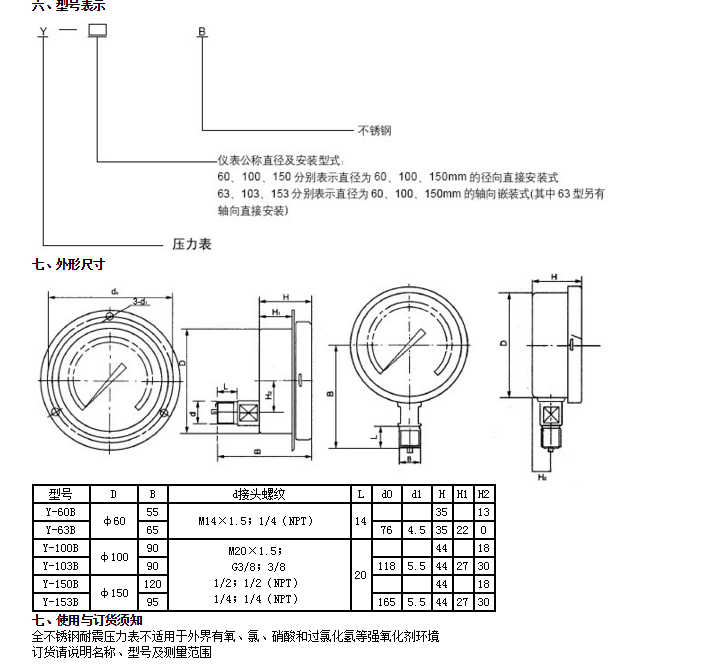| 不銹鋼壓力表 | Y-60B-F | 0~0.1;0.16;0.25;0.4;0.6;1.0; 1.6;2.5;4;6;10;16;25;40;60; -0.1~0;0.06;0.15;0.3;0.5;0.9;1.5;2.4~60 |