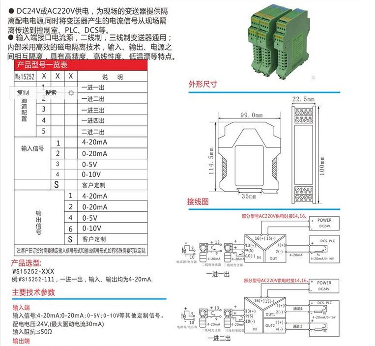 信號(hào)隔離器分配器輸入范圍:0-10V、4-20mA、0-20mA、0-5V、0-75mV等用戶特定規(guī)格WS15252信號(hào)隔離器詳細(xì)技術(shù)參數(shù)及接線方式: