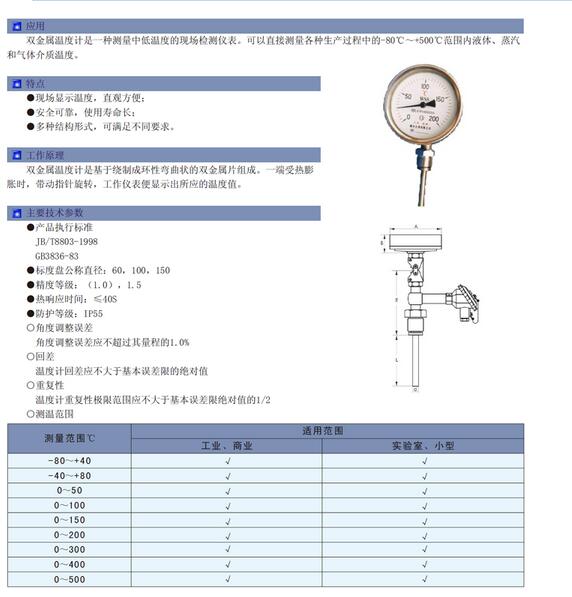 雙金屬溫度計(jì)是基于繞制成環(huán)性彎曲狀的雙金屬片組成。一端受熱膨脹時(shí),帶動(dòng)指針旋轉(zhuǎn),工作儀表便顯示出所應(yīng)的溫度值