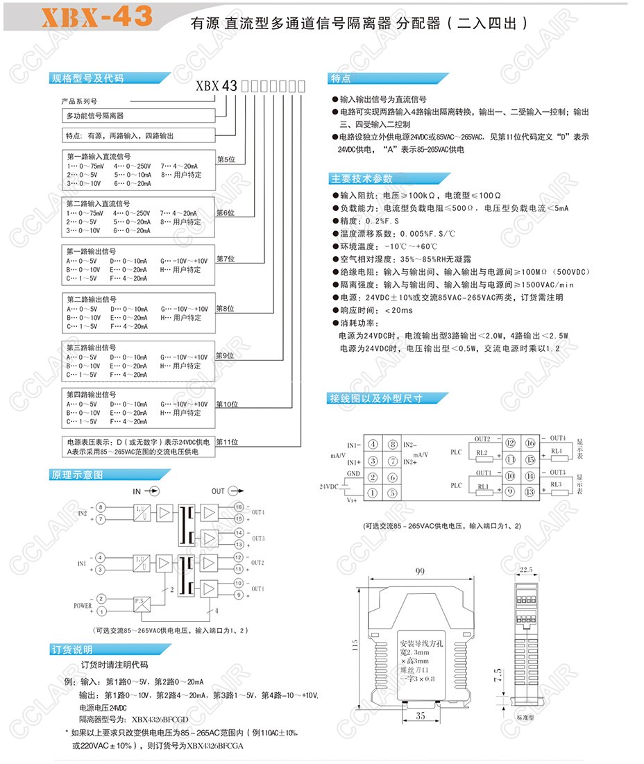 XBX-43,XBX-43-11AAAA,XBX-43-22AAAA,有源直流型多通道信號隔離分配器(二入四出)