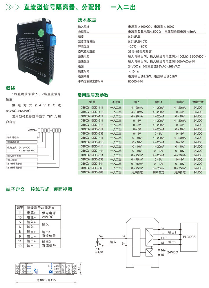 XBXG-12DD,XBXG-12DD-111,XBXG-12DD-113,XBXG-12DD-114,直流信號(hào)隔離器、分配器(一入二出)
