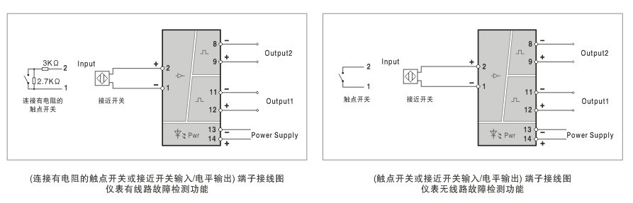 本儀表出廠設(shè)定為: 當(dāng)檢測到輸入線路故障時(shí), 儀表面板上的故障檢測指示燈亮,輸出繼電器觸點(diǎn)為松開狀態(tài) ( 如果是晶體管輸出,則晶體管不導(dǎo)通;   如果是電平信號輸出,   則輸出為低電平信號)。