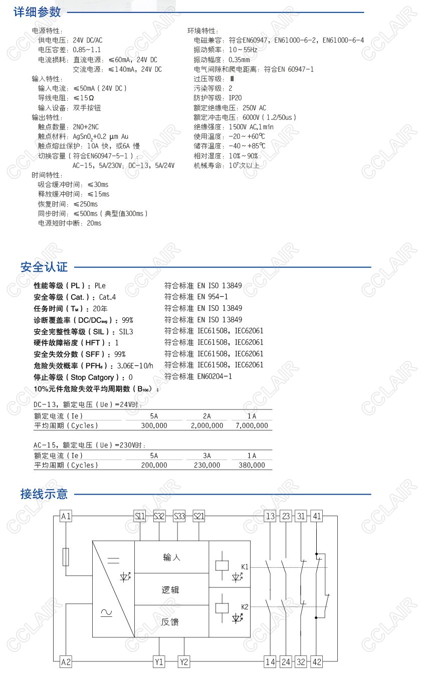CZSR8001-3A1B是適用于雙手按鈕,具有3路NO(常開)安全輸出觸點(diǎn)和1路NC(常閉)輔助輸出觸點(diǎn)的安全繼電器。它具有雙通道輸入模式,可自動(dòng)復(fù)位,并具有不超過(guò)0.5s的同步檢測(cè)功能。