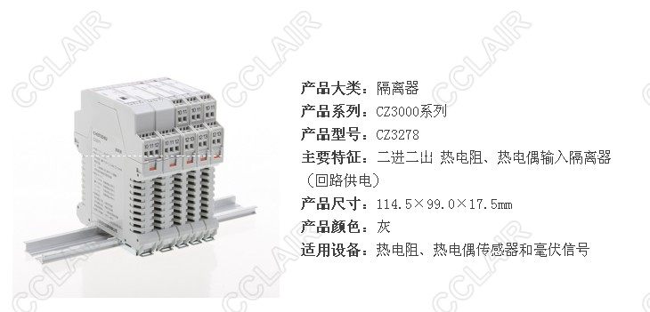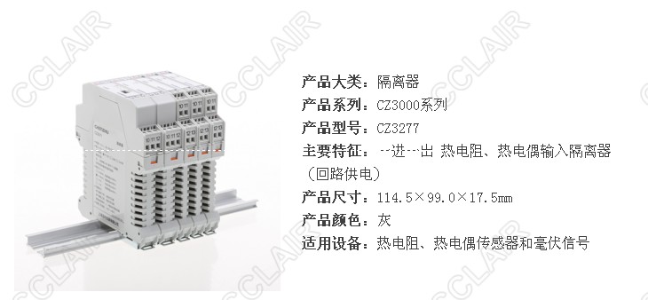 CZ3277 一進(jìn)一出 熱電阻、熱電偶輸入隔離器(回路供電) 信號(hào)類型和測(cè)量范圍可編程,PT100冷端傳感器,高精度自動(dòng)冷端補(bǔ)償,超量程、斷線檢測(cè)與報(bào)警功能。 CZ3278 二進(jìn)二出 熱電阻、熱電偶輸入隔離器(回路供電) 信號(hào)類型和測(cè)量范圍可編程,PT100冷端傳感器,高精度自動(dòng)冷端補(bǔ)償,超量程、斷線檢測(cè)與報(bào)警功能。