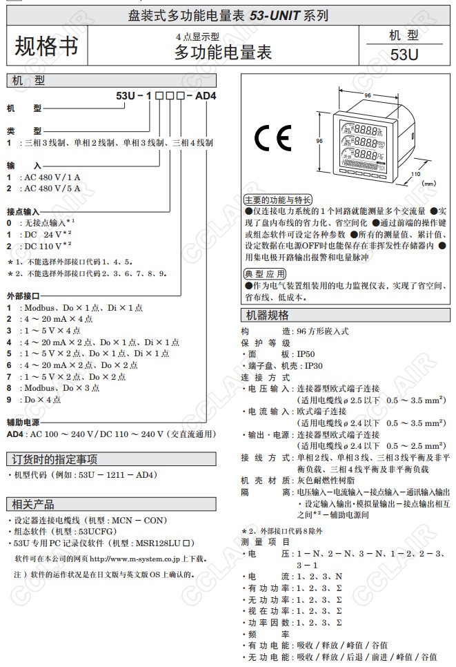 53U,53U-1211-AD4,53U-110,53U-111,53U-112,53U-120,4點(diǎn)顯示型 配電盤嵌入式多功能電量表