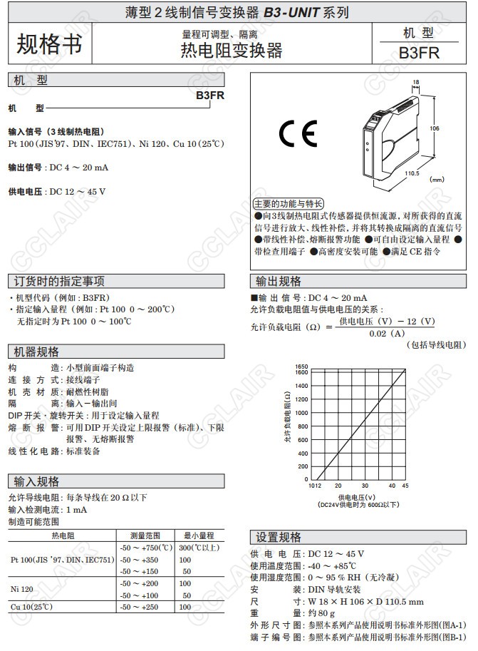 B3FR,熱電阻變換器(量程可調(diào)型、隔離)