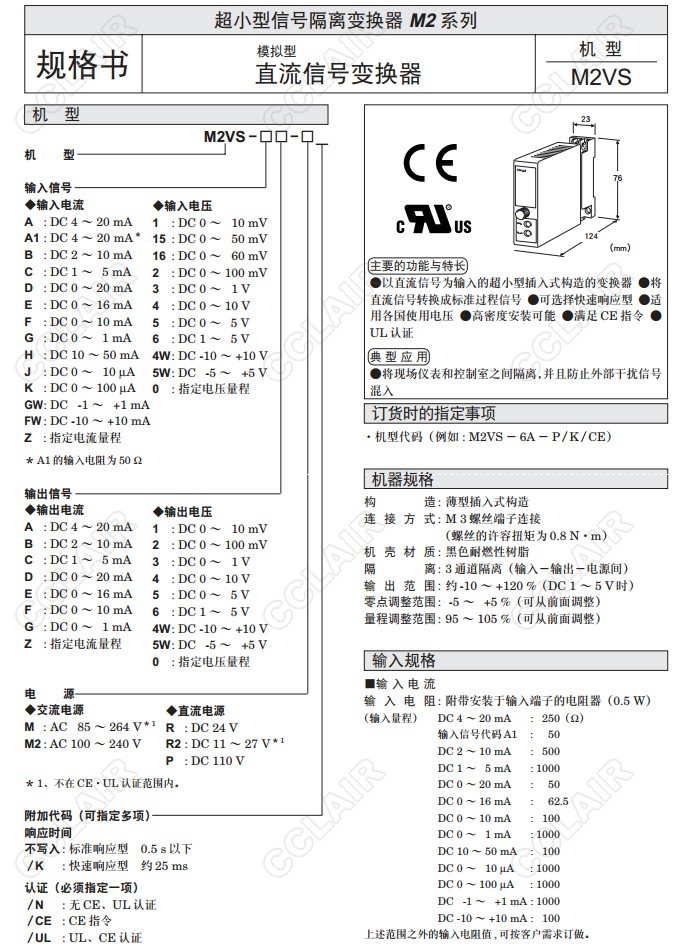 M2VS,M2VS-6A-P/K/CE,M2VS-A,M2VS-A1,M2VS-B,M2VS-C,M2VS-D,M2VS-E,直流信號變換器(模擬型)
