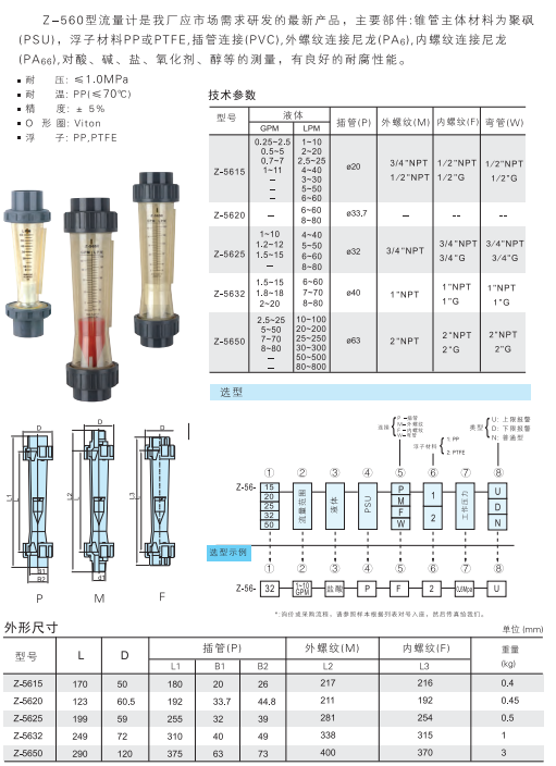 型號: Z-5615,Z-5620,Z-5625,Z-5632,Z-5650,聚砜管流量計