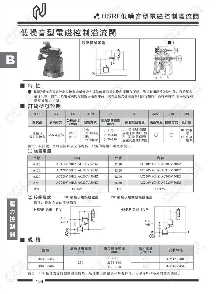 Northman臺(tái)灣北部精機(jī),低噪音型電磁控制溢流閥HSRF-G03-1PN-1-L-A110-10-30,HSRF-G03-1PN-1-L-R240-10-32,HSRF-G03-1NP-1-L-A240-10-32,HSRF-G03-1PN-2-R-R240-20-32,HSRF-G03-1NP-1-L-D24-10-30,HSRF-G06-1PN-1-R-R220-10-32,HSRF-G06-1NP-3-R-D12-20-32