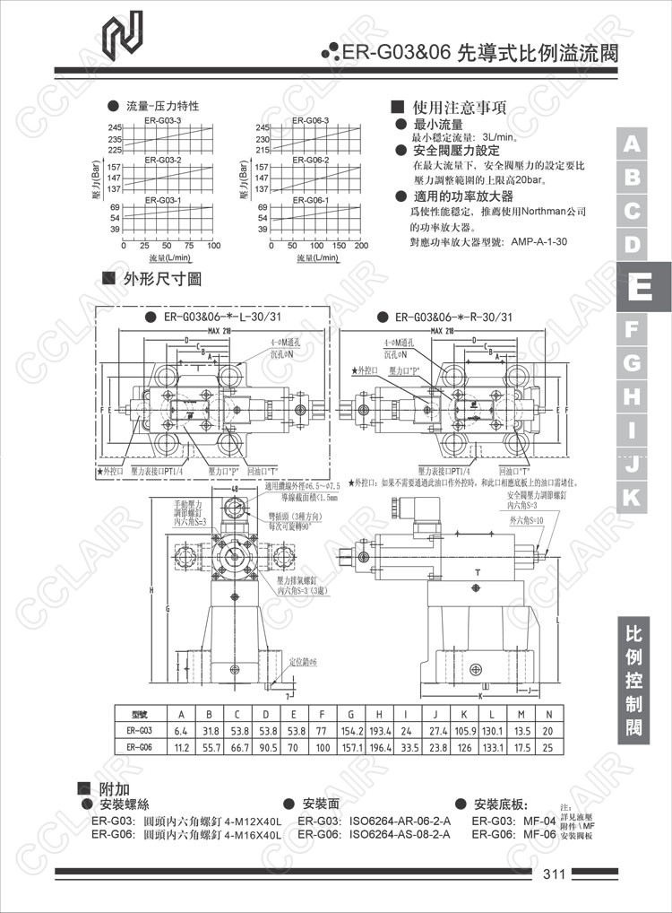 Northman臺灣北部精機,先導(dǎo)式比例溢流閥ER-G03-1-L-30,ER-G03-1-L-31,ER-G03-2-R-30,ER-G03-2-R-31,ER-G03-3-L-30,ER-G03-3-L-31,ER-G06-2-R-30,ER-G06-2-R-31,ER-G06-3-L-30,ER-G06-3-L-31,ER-G06-3-R-30,ER-G06-3-R-31