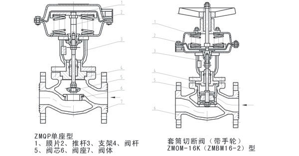 3 主意務(wù)必按ZMQM氣動薄膜套筒切斷所示的介質(zhì)流動方向(閥體上的箭頭)安裝電動單座調(diào)節(jié)閥。