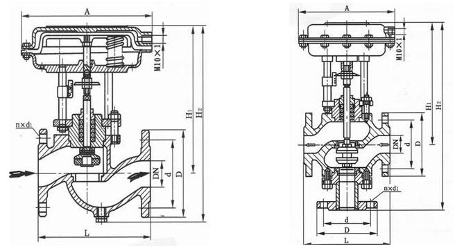 本系列產品有薄膜式、活塞式兩種。閥體結構有單座、套筒、雙座(二位三通)三種,密封形式有填料密封和波紋管密封兩種,產品公稱壓力等級有PN10、 16、40、46四種,公稱口徑范圍DN20~200mm。適用流體溫度由-60~450℃。泄漏量等級為IV級或VI級。流量特性為快開。