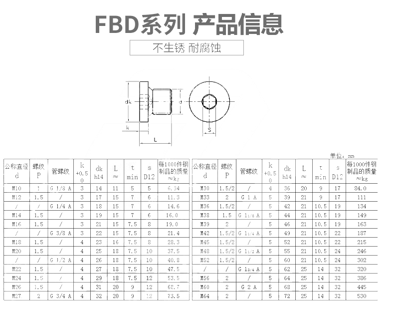 堵頭 不銹鋼FBD-M8*1S FBD-G1/8S FBD-M10*1S FBD-G1/4S FBD-M12*1.5S FBD-G3/8S FBD-M14*1.5S FBD-G1/2S FBD-M16*1.5S FBD-G3/4S FBD-M18*1.5S FBD-G1S FBD-M20*1.5S FBD-G11/4S FBD-M22*1.5S FBD-G11/2S 不銹鋼FBD-M24*1.5S FBD-G2S FBD-M27*1.5/2S FBD-M30*1.5/2S