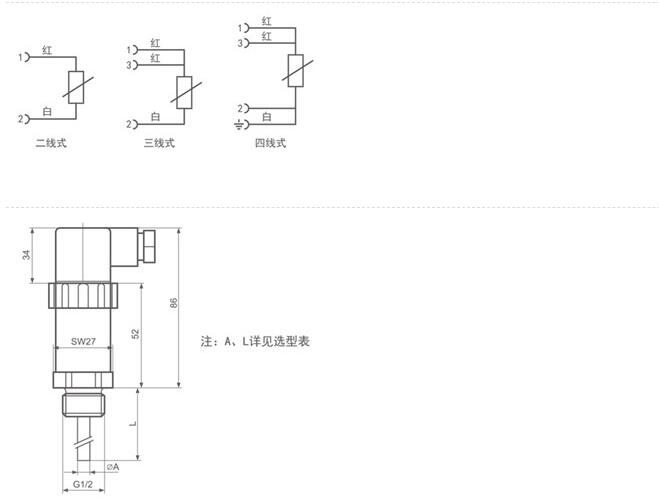 TP10包含一個(gè)PT100探頭,PT100阻值會(huì)隨溫度變化而變化,TP10有二線式,三線式,四線式幾種規(guī)格可供選擇。