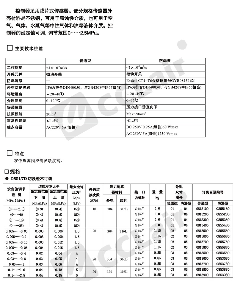 0855180,0853580,0855280,0853680,壓力控制器 防爆 D501/7D切換差不可調(diào) 0855380,0853780,