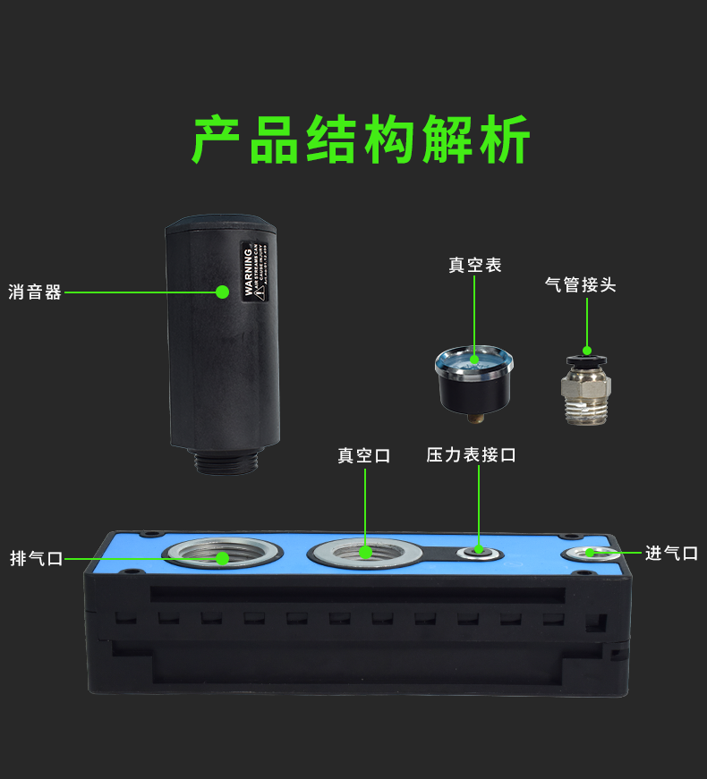 真空發(fā)生器的工作原理主要依賴(lài)于拉瓦爾噴管、?負(fù)壓腔和接口管等組件。?氣流從供氣口進(jìn)入,?經(jīng)過(guò)噴管射出,?形成高速射流。?由于氣體的黏性,?高速射流會(huì)吸走負(fù)壓腔內(nèi)的氣體,?從而在該腔內(nèi)形成真空。