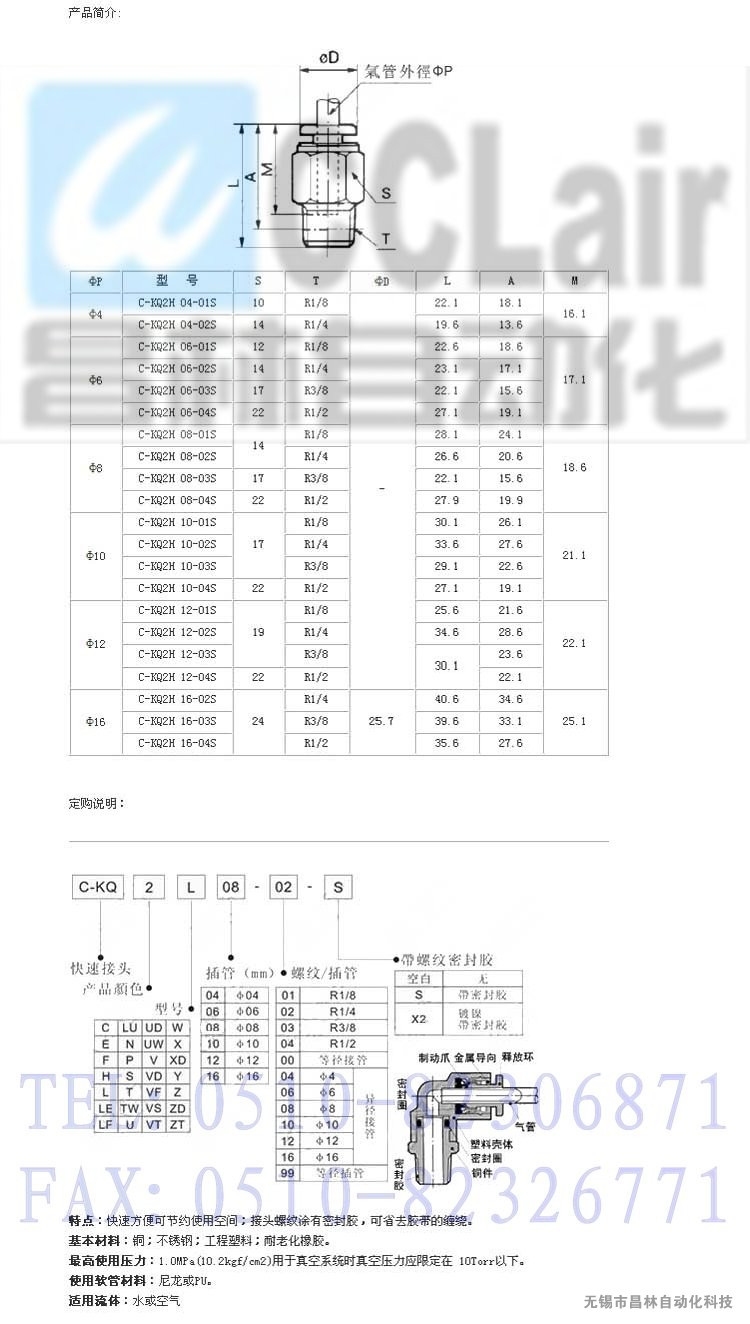C-KQ2H06-01S,C-KQ2H06-02S,C-KQ2H06-03S, C-KQ2H06-04S, 外螺直接頭