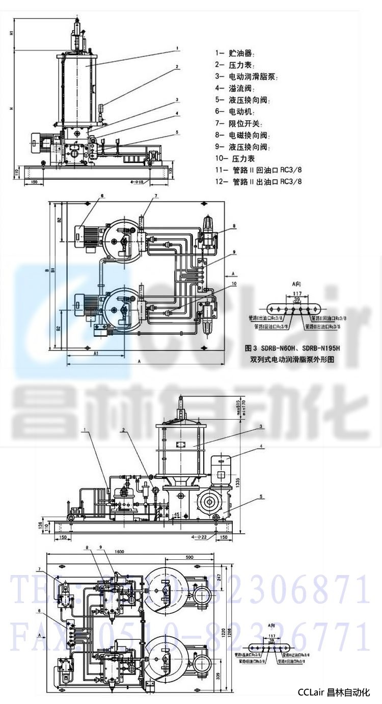 | 1 - 壓力表;2 - 壓力表;3 - 貯油器;4 - 電動機;5 - 電動潤滑脂泵 6 - 液壓換向閥;7 - 電磁換向閥;8 - 液壓換向閥;9 - 限位開關(guān) |