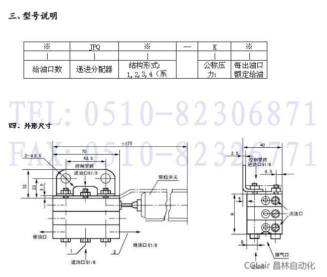 1、分配器為單柱塞多片組合結構,每片有兩個出油口,分為JPQ1、JPQ2、JPQ3 和JPQ4四種形式。 六、訂貨須知 |