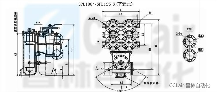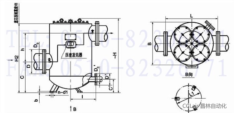 法蘭標(biāo)準(zhǔn):GB573-65(可根據(jù)需要確定):DN100、150-3 組濾芯組件 DN200-4 組濾芯組件;壓差發(fā)訊器為選配件。