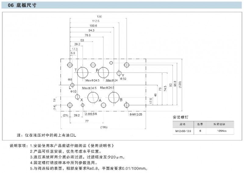 二、技術(shù)參數(shù):規(guī)格 06 10 最高工作壓力 (MPa) 31.5 最大流量 (L/min) 220 430 工作介質(zhì) 礦物質(zhì)液壓油;磷酸脂 介質(zhì)油溫范圍 (℃) -20~70 介質(zhì)粘度范圍 (mm2/s) 2.8~380 開啟壓力 (MPa) a:0.05 b:0.4 工作電壓 (V) 直流 24 *交流 127, 220 防護(hù)等級 IP55