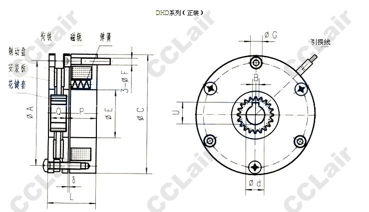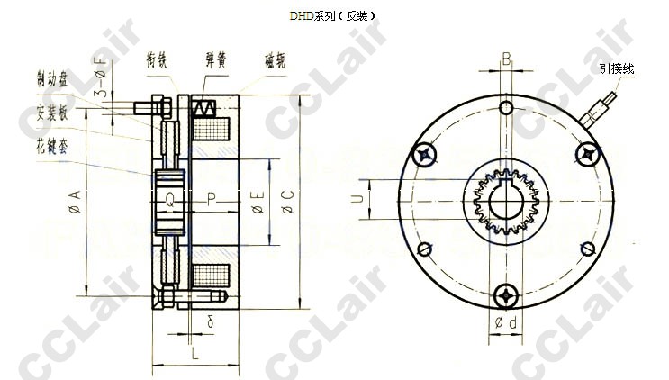 制動(dòng)器由磁軛、勵(lì)磁線圈、彈簧、制動(dòng)盤、銜鐵、花鍵套、安裝鏍釘?shù)冉M成,制動(dòng)器安裝在設(shè)備的法蘭盤(或電動(dòng)機(jī))的后端伸;傳動(dòng)軸與花鍵套與制動(dòng)盤聯(lián)結(jié)。